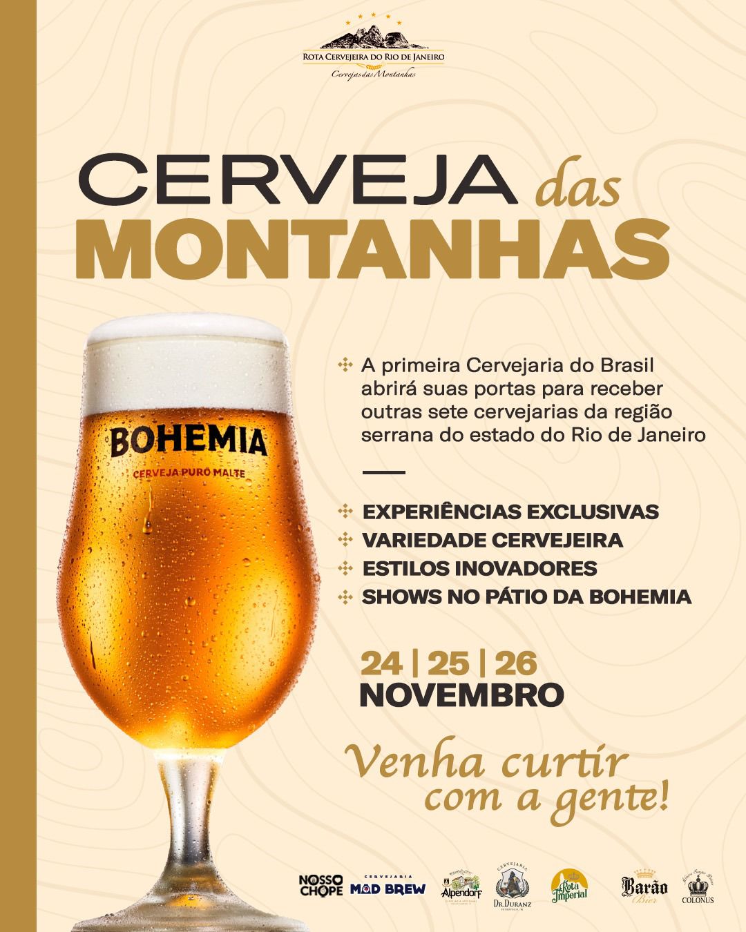 A Cervejaria Bohemia vai receber a Rota Cervejeira RJ em mais uma edição do Cerveja das Montanhas. O encontro cervejeiro acontece esta semana, entre os dias 24, 25 e 26/11. A primeira Cervejaria do Brasil abrirá suas portas para receber outras oito cervejarias de destaque no cenário artesanal da região serrana do estado do Rio de Janeiro. Esta colaboração proporcionará aos visitantes uma experiência exclusiva, com grande variedade cervejeira, desde rótulos clássicos à estilos inovadores!