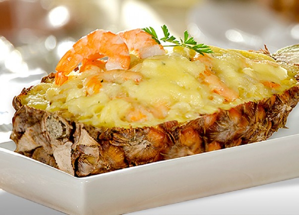 – Camarão Thay gratinado dentro do abacaxi. Acompanha arroz de castanha.