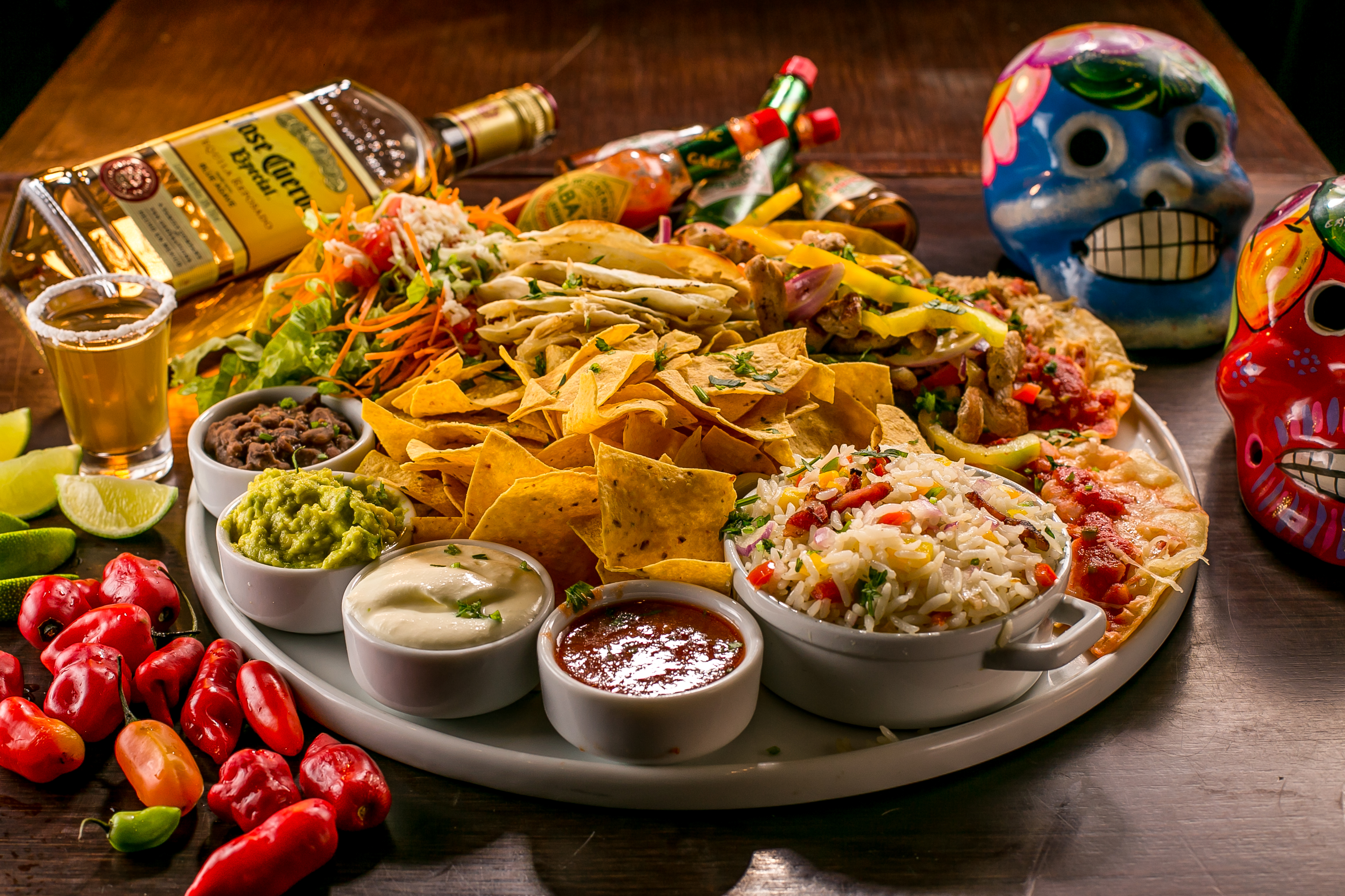 – Combo de comida mexicana para 2 pessoas. Composto de 2 unidades de tacos, 1 unidade de quesadilla, nachos de milho, fajitas de lombo, totopos, sour cream, pico de galo, guacamole, chilli e arroz mexicano.
