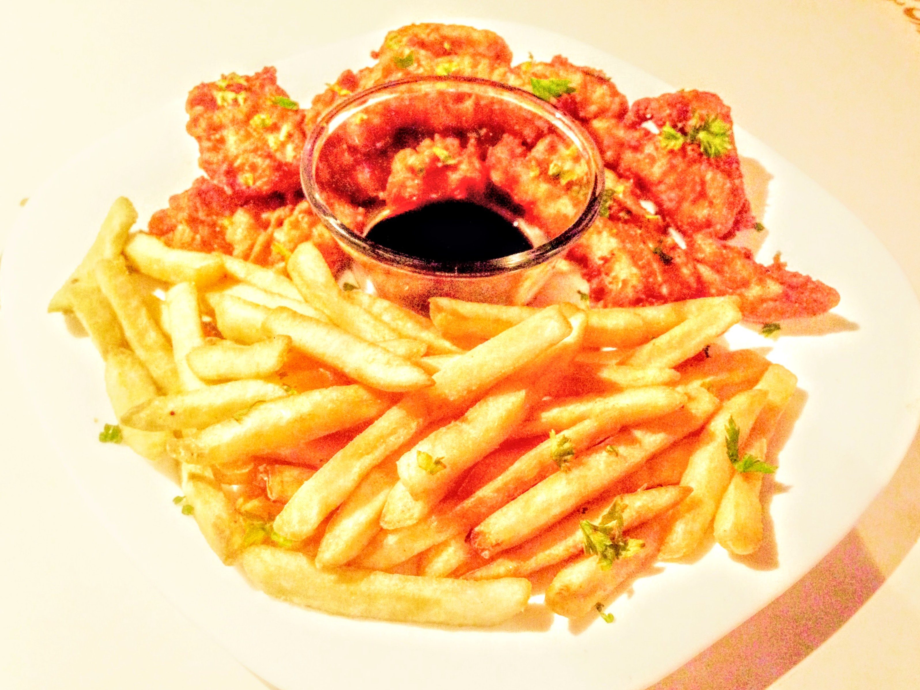 – Fish and Fries (tiras de peixe empanado com fritas), prato típico dos pubs londrinos. Acompanha molho tarê.
