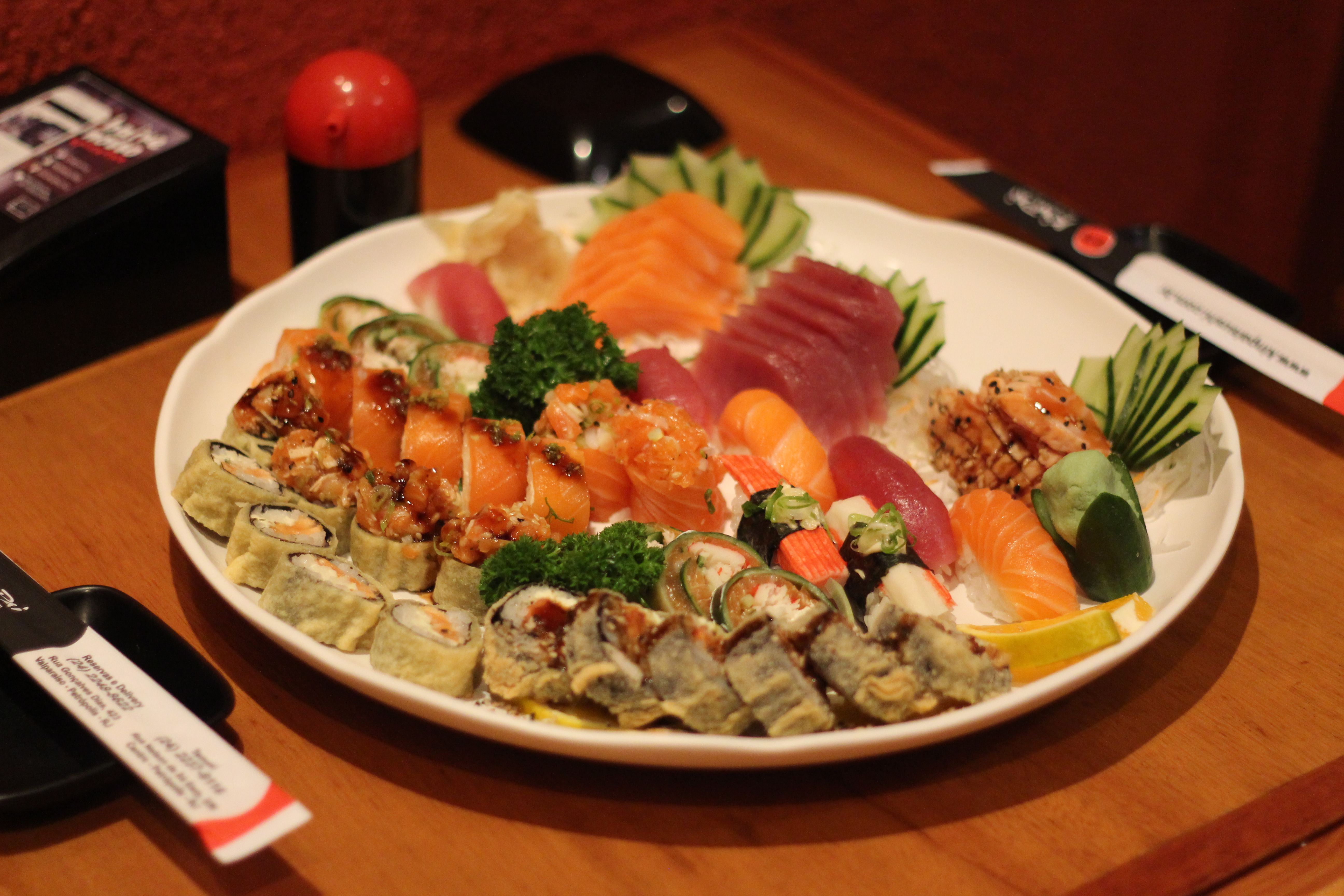 – Combinado do Chef para 2 pessoas – 40 peças: 4 sashimi salmão, 4 sashimi atum, 4 salmão goma, 4 nigri salmão, 4 shake lemon, 6 kiuri, 4 hot shake, 4 hot, 6 monte imperial.