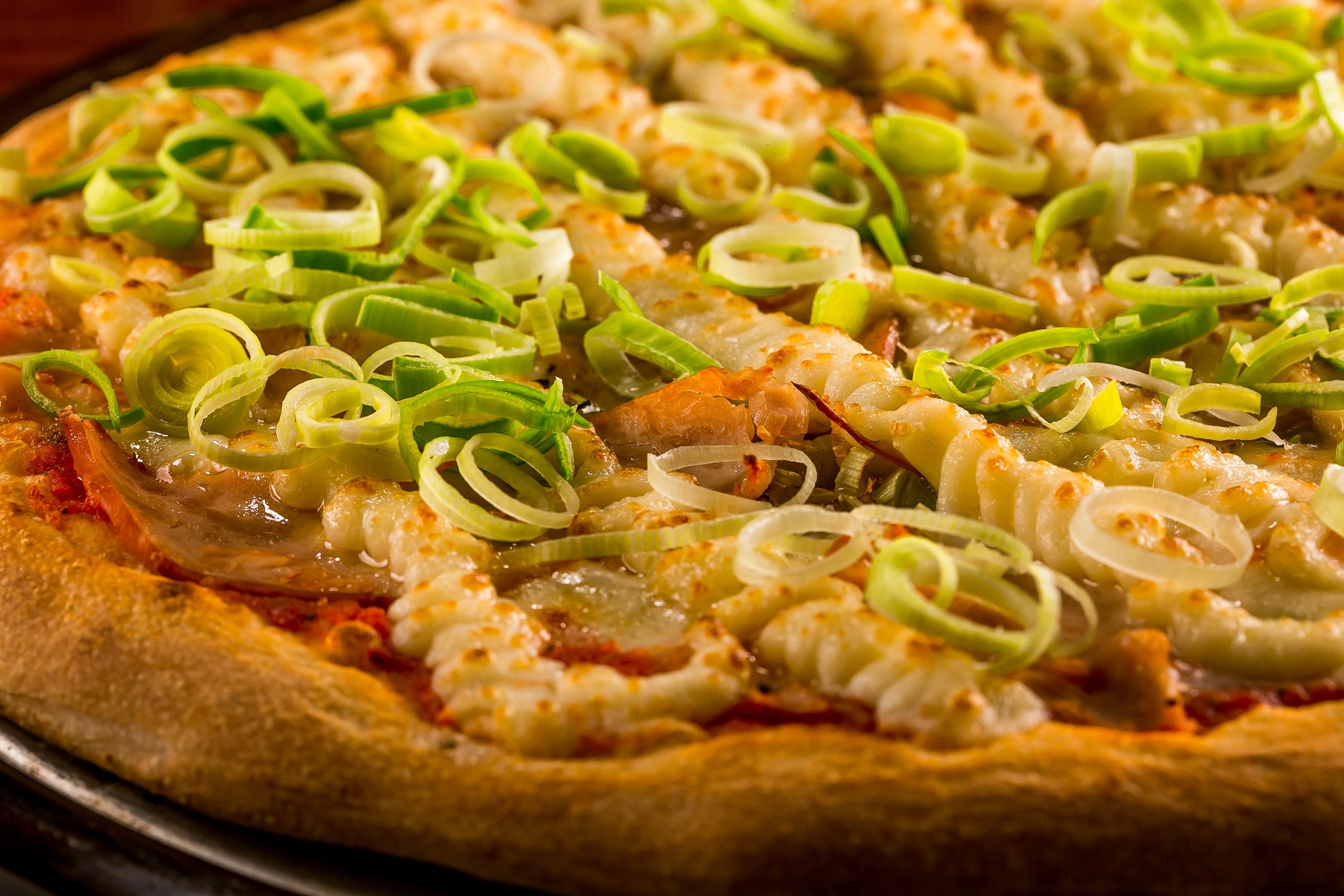 – Pizza de Salmão Defumado. Alho poró, o verdadeiro catupiry, salmão defumado e pimenta biquinho.