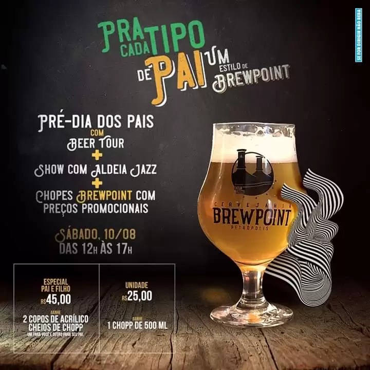 A Cevejaria Brewpoint, também de Petrópolis, preparou um beer tour para este sábado, dia 10/08, a partir das 12h. A ideia é que os filhos levem seus pais para degustar um belo chope dentro da cervejaria. De quebra, os grupos ainda assistem show de jazz com o grupo Aldeia Jazz e degustam delícias da Vielen defumados!