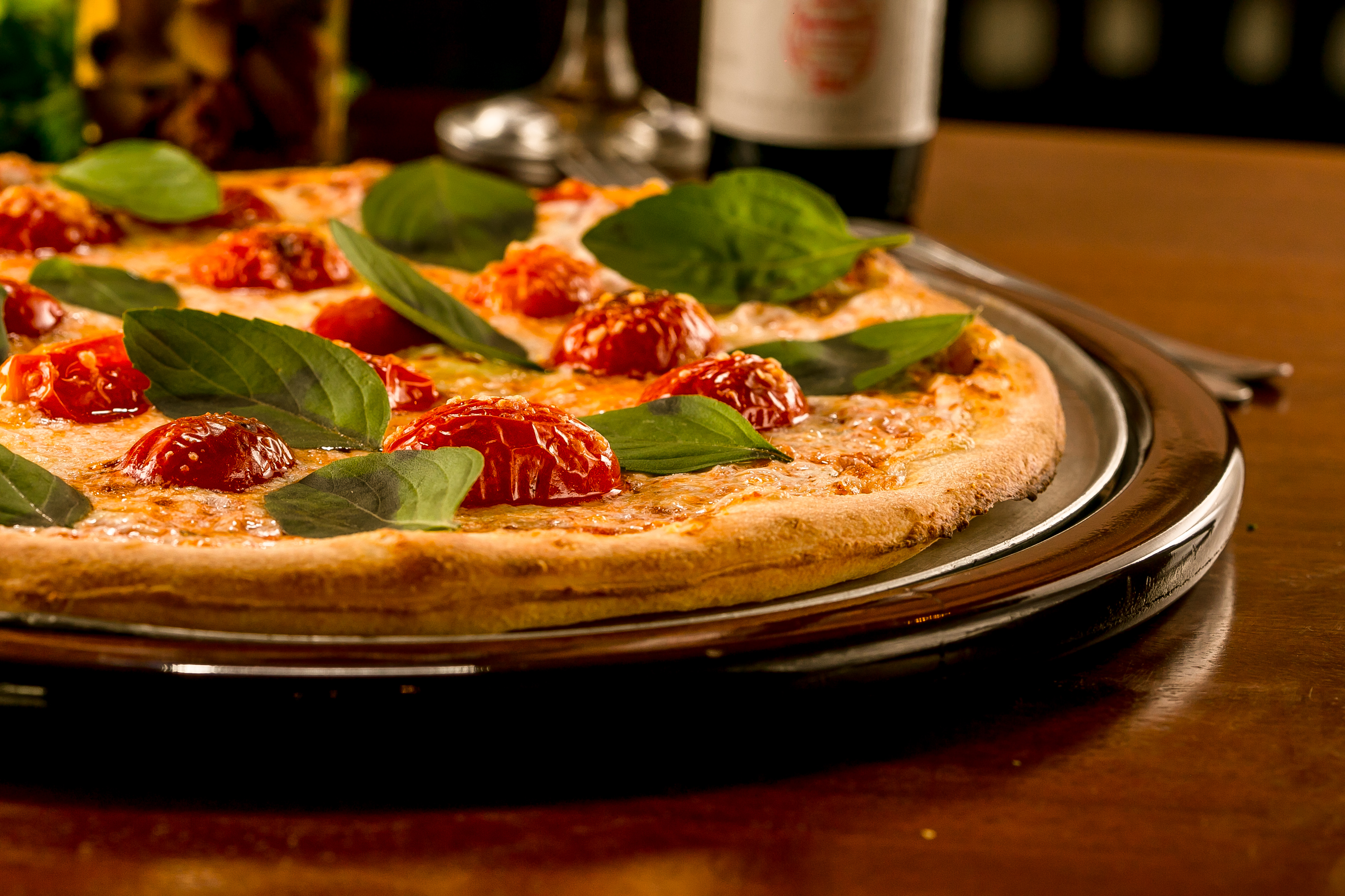 Pizza Marguerita DOC. Feita com muçarela de búfula, tomates cereja, uma leve pitada de queijo parmesão, finalizada com azeite de alho e folhas frescas de manjericão.