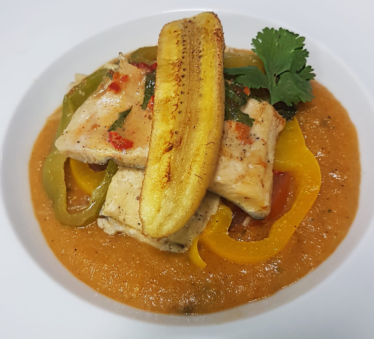 Peixe branco grelhado com salada e creme cítrico. Sobremesa: Verrine de frutas vermelhas (creme branco com geleia de frutas vermelhas, crocante de biscoito e morango)